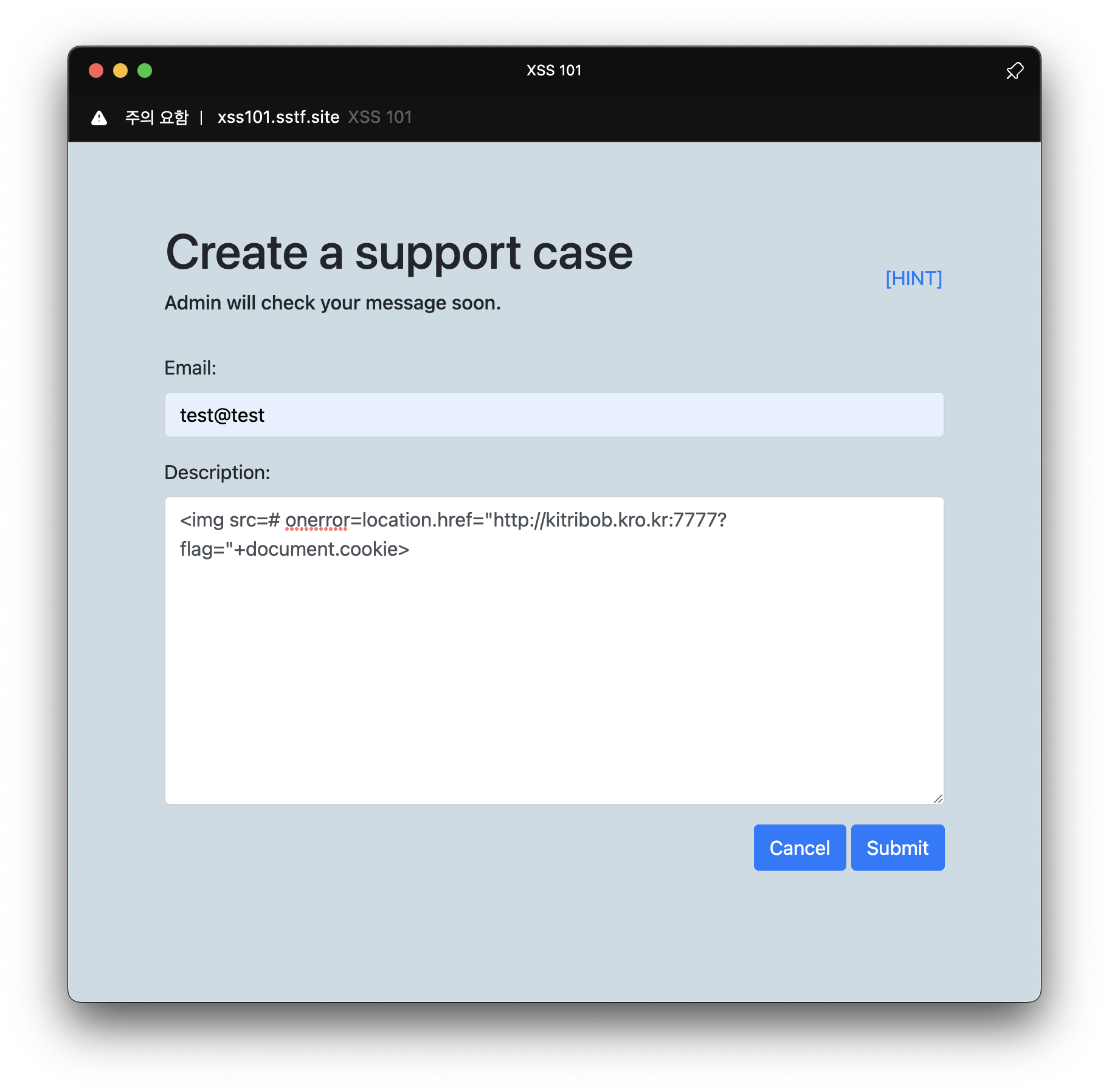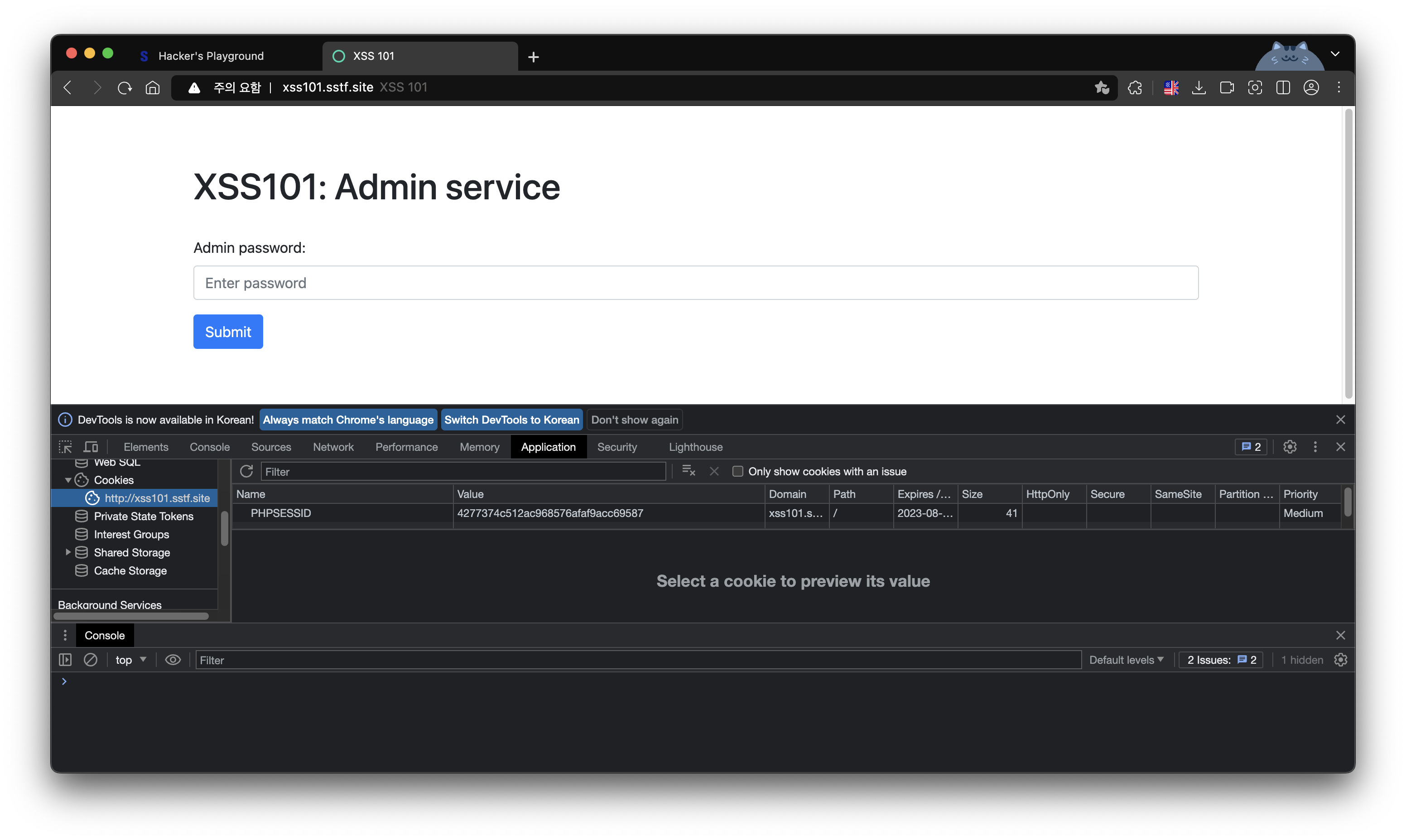 http://xss101.sstf.site/admin.php 로 접속하면 Admin service를 확인할 수 있다.