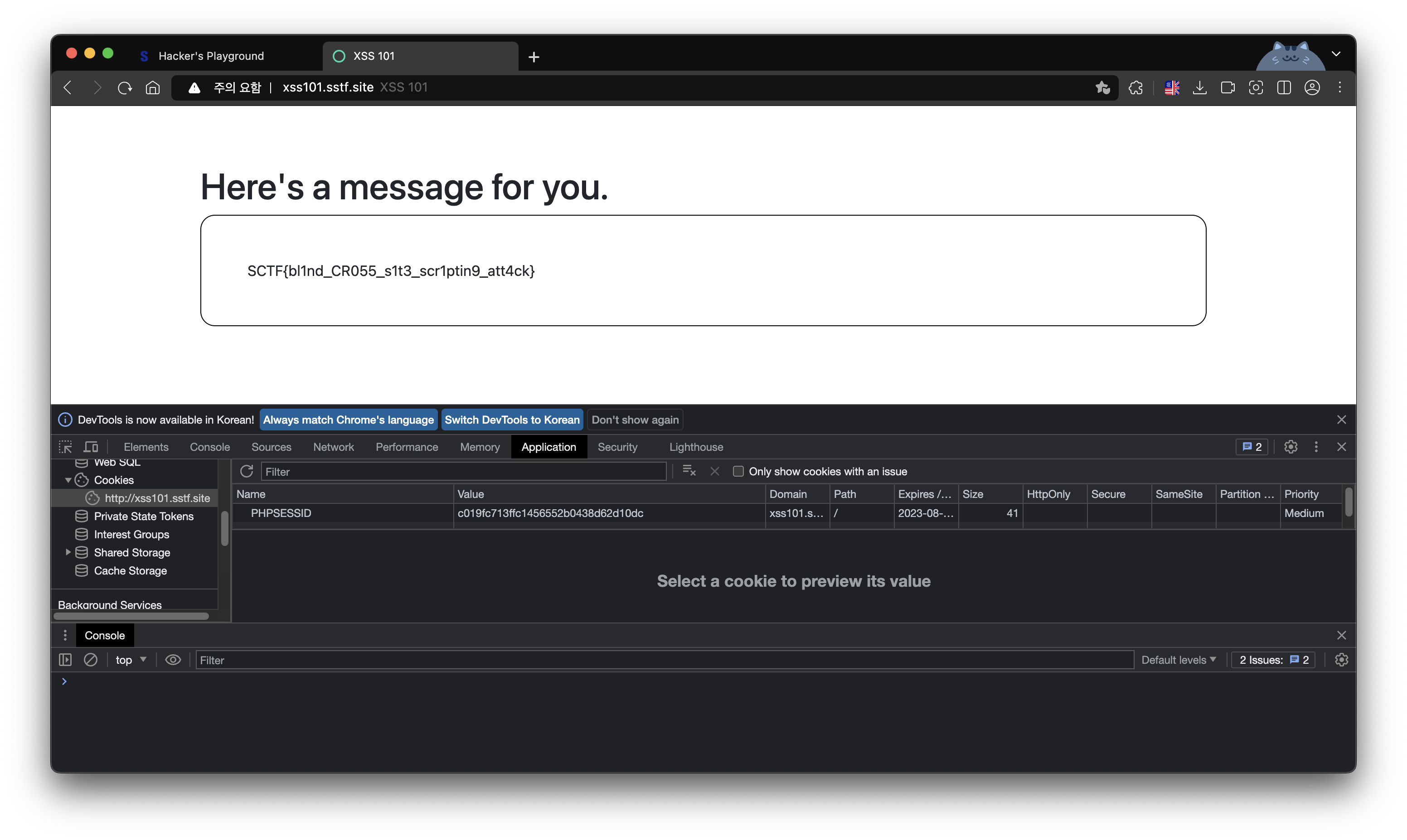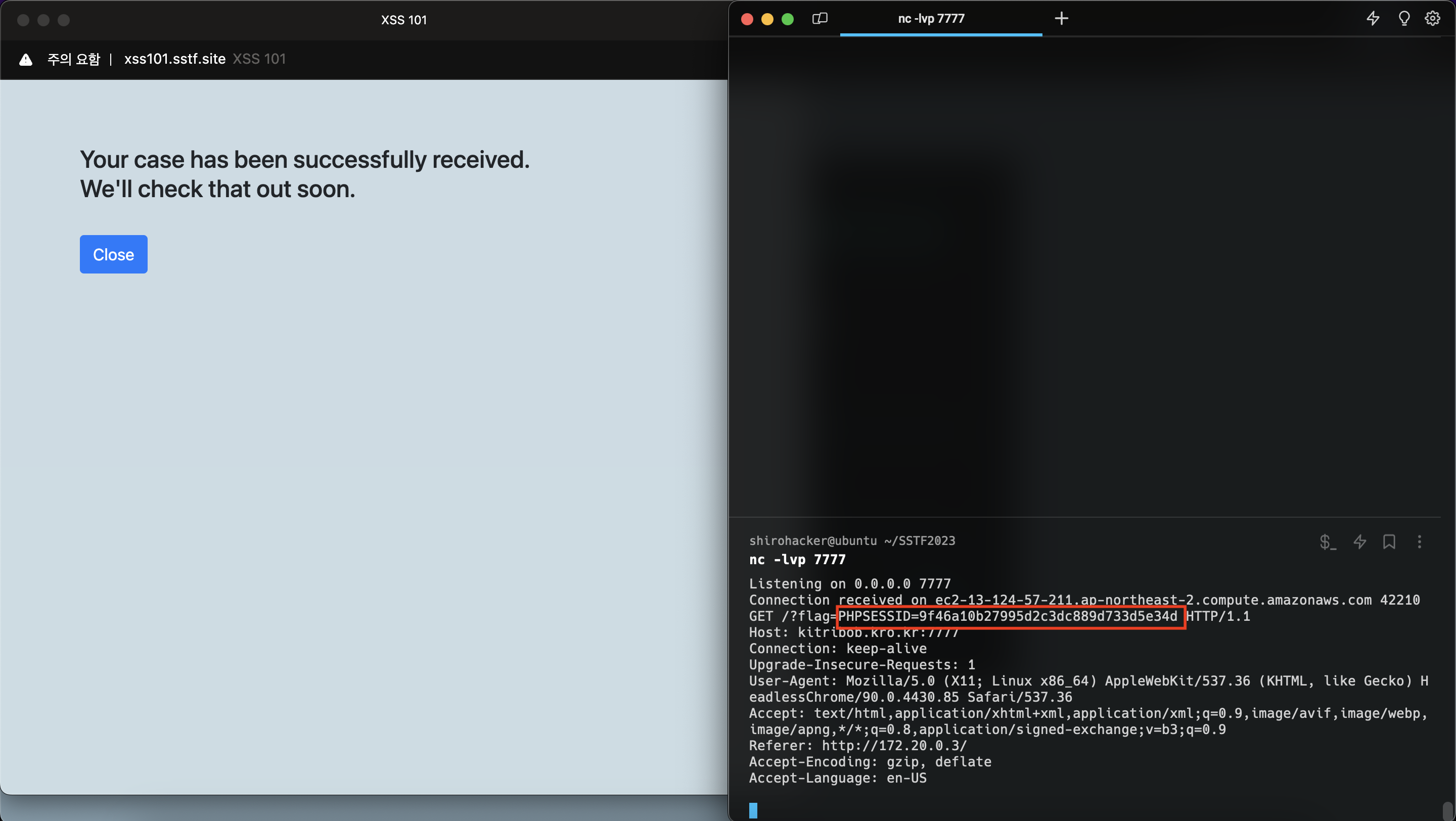 "Admin will check your message soon." 문구에 힌트를 얻어 내가 보낸 메시지를 관리자 봇이 바로 확인한다는 것을 유추할 수 있었고, nc로 listening 서버를 열어 관리자의 세션을 얻었다.