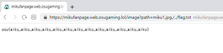 결국 req.query.path는 miku1.jpg./../flag.txt가 되고 flag를 읽을 수 있다.
