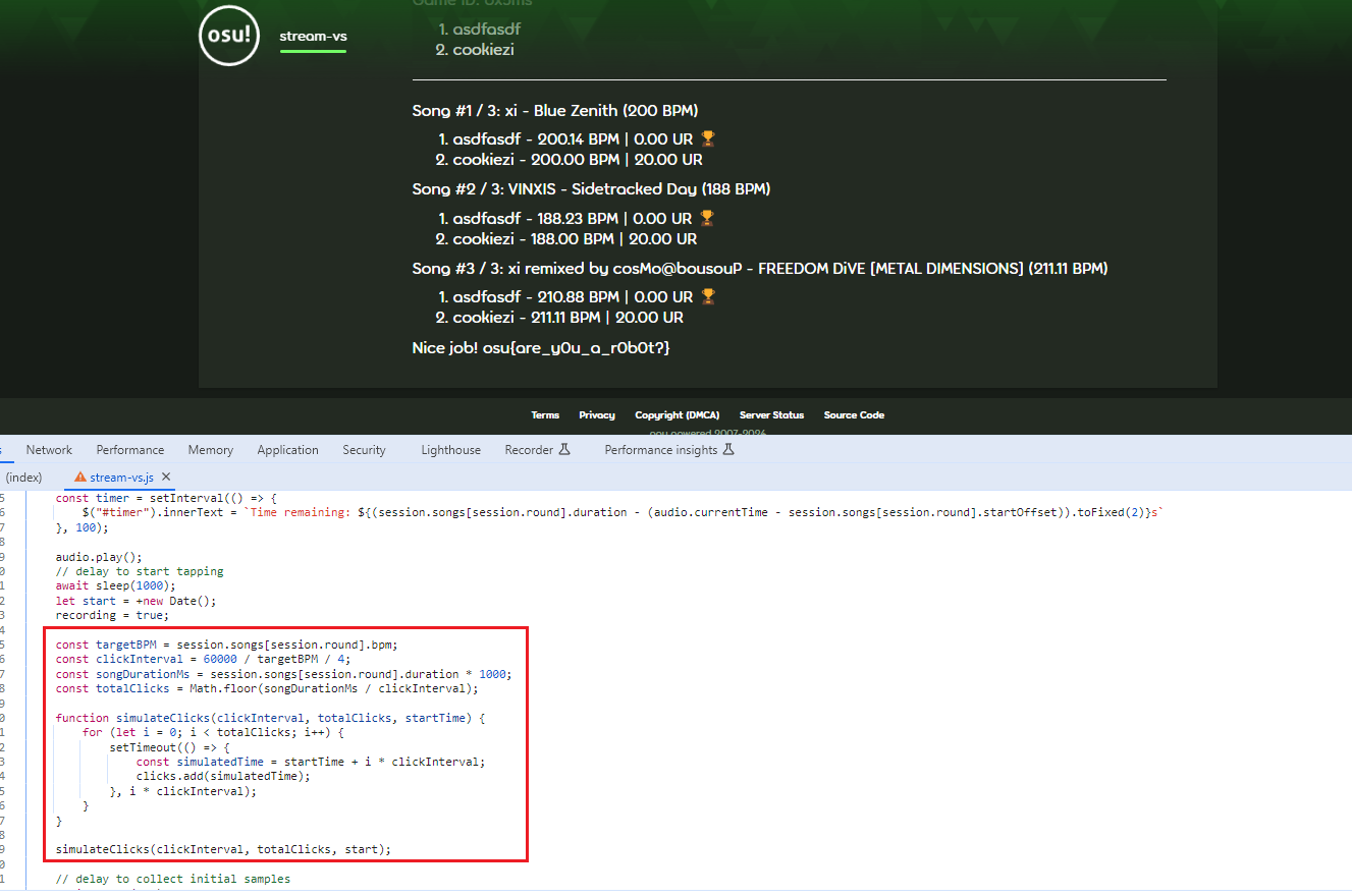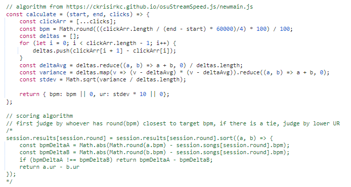 점수 알고리즘을 보면, BPM으로 먼저 판단하고, 동일하면 더 적은 UR을 가진 참가자가 우승한다. 봇은 BPM이 항상 목표 BPM과 일치하고, UR은 20.00이 나온다. 결국 BPM을 session.songs[session.round].bpm과 정확하게 일치시키고 UR값을 20 미만으로 만들어야한다.