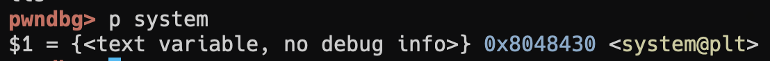 PIE가 활성화되어 있지 않으므로 system() 주소는 고정이다.