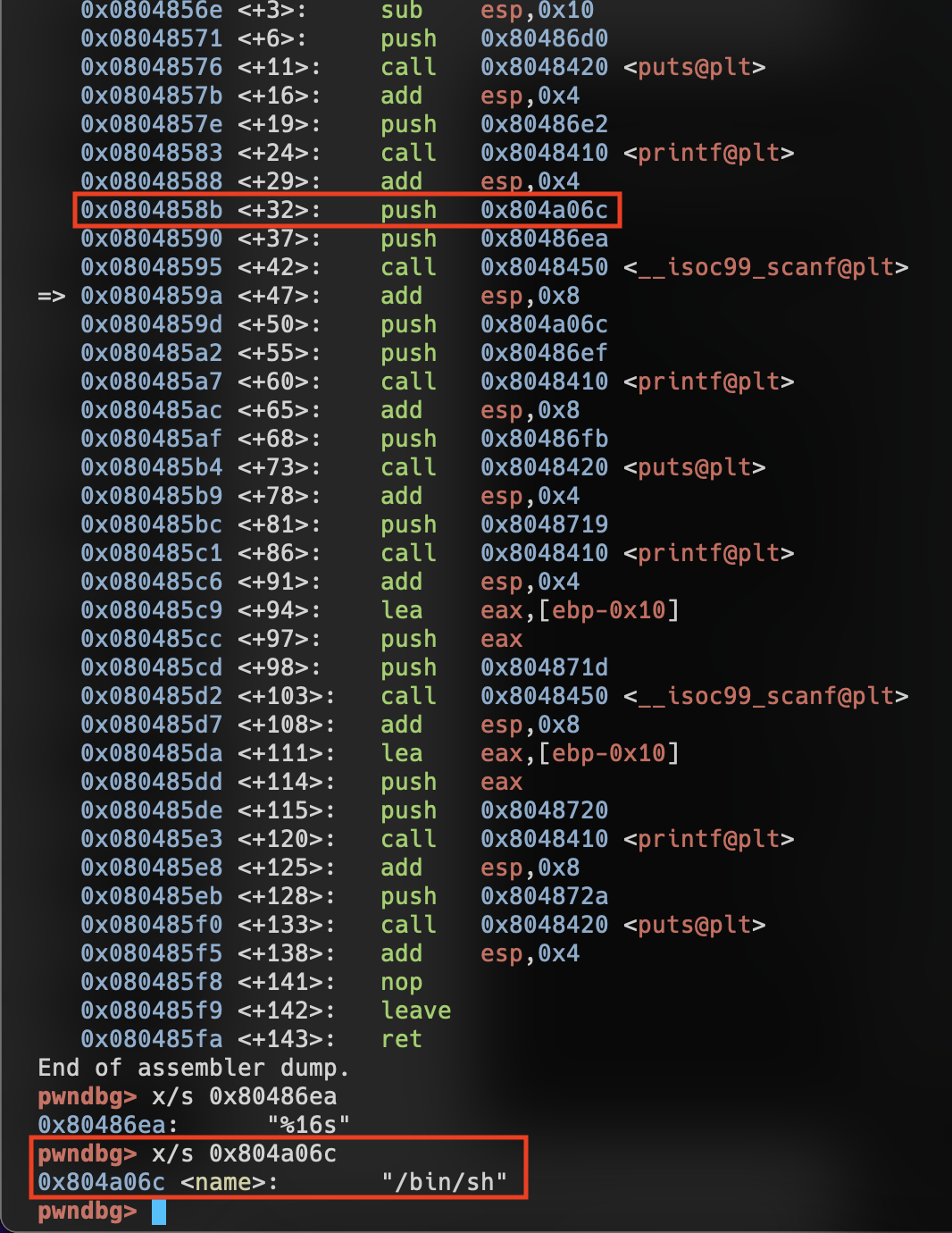 이 부분에 "/bin/sh" 문자열을 입력하고 system() 함수의 인자값으로 name 주소값을 넘겨주면 된다.
