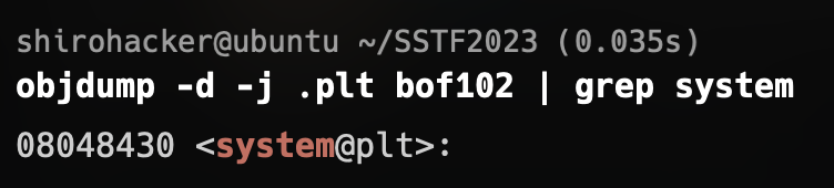 system() 함수의 주소는 main() 함수에서 사용하고 있기 때문에 .plt 섹션에서 찾을 수 있다.